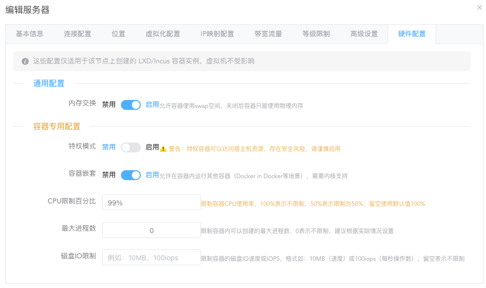 这样设置是为了特殊化当前节点对应等级的用户可开设的实例的配置限制,避免有时候全局限制不适用当前节点,全局限制在系统配置中可设置,一般用于用户整个账户层面的使用资源限制。